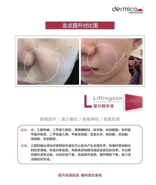 효능: 리프팅 에센스는 아세틸콜린을 보충하고, 콜린은 신호를 전달하여 근육을 수축시키는 신경 섬유의 방출이며, 표피 피부가 수축되고 즉시 리프팅 및 조여집니다.처진 눈꺼풀을 들어 올리고, 얼굴을 빠르게 들어 올리고, 처짐과 싸우십시오., 섬유 아세포를 자극하여 콜라겐 성장을 달성하고 피부를 조이고 피부 탄력을 증가시킵니다.