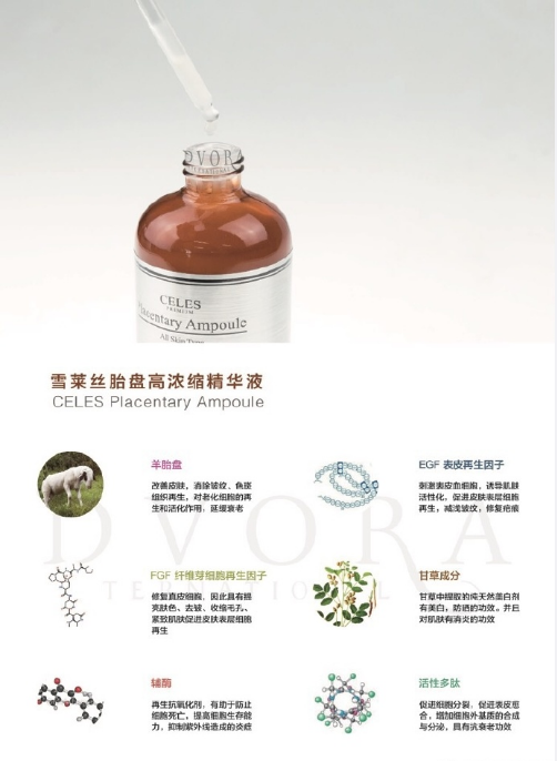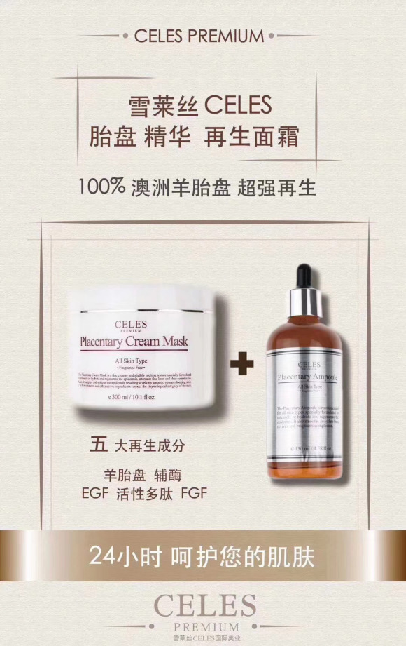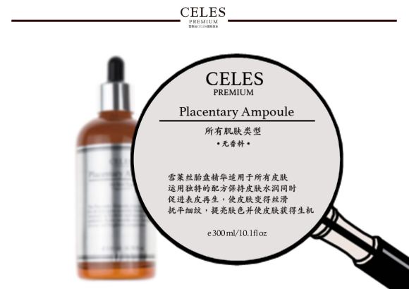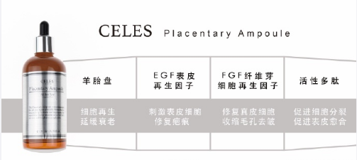 celes面膜,胎盘精华不含任何人工香剂,主要成分是可以帮助皮肤快速再生和皮肤恢复的羊胎盘提取物(Hydrolyzed Placental Extract),还有上皮细胞生长因子(Epidermal Growth Factor),纤维芽细胞生长因子(Fibroblast Growth Factor),Glabridine, 泛醌-辅酶(Ubiquinone), 细胞活素(Cytokine)等有效的生理活性物质按照秘方配比组成。在增加皮肤免疫力,自然治愈力,提高皮肤细胞新陈代谢速度和抑制诱发细胞损伤的活性氧等方面效果显著,从获得皮肤的再生力,美白,抗氧化,保湿,增加弹性,改善皱纹,去除痘印等效果。