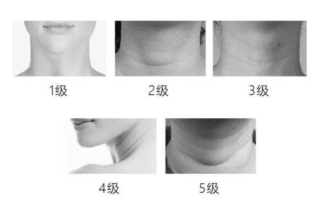 不同的成因和生活习惯,会造成不同程度的颈纹,颈纹共分为5级,当达到第五级时,很难得到完全治愈,只能通过治疗改善至4级左右。