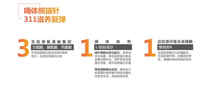 가교되지 않은 히알루론산 함유 : 수분보충, 세포외기질환경개선, 콜라겐 재생 촉진 3가지 아미노산인 글리신, 프롤린, 알라닌, 콜라겐은 세포에 공급하는 3가지 아미노산 중 가장 많이 함유 콜라겐 단백질을 분비하는 비타민 B2: 콜라겐 포름산이 콜라겐 섬유를 패킹 및 합성하여 Duan Li의 콜라겐 섬유를 복구 L carnosine: 항당화, 항산화, 콜라겐 및 콜라겐 섬유가 더 오래 지속되도록 합니다.