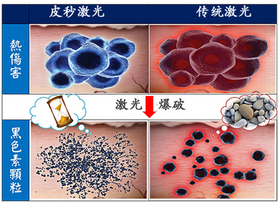 如果我們把原本的色素顆粒比喻為岩石的話,傳統的調Q激光就可以把這些岩石擊碎為鵝卵石大小,而使用皮秒激光之後就可以將其擊碎為細沙,這樣色素碎片吸收效率就極大提高了。