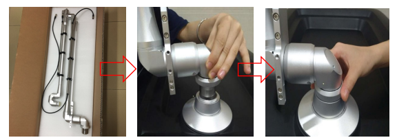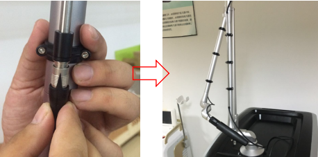 1.1導光臂安裝:將導光臂取出後直接垂直放入主機的導光臂連接口,然後旋轉螺母固定即可;
