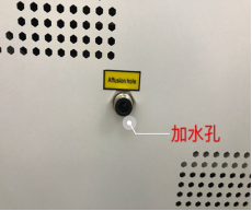 1.4加水:將排水管插入主機底部左邊溢水孔,漏斗插入加水孔,通過漏斗加入蒸餾水直至溢水孔有水流出即已加滿;